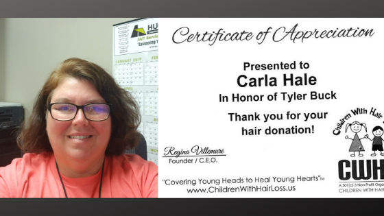 After noticing her significant haircut, some coworkers learned that Carla Hale, payroll administrator at Hugg & Hall Equipment Company (Hugg & Hall), recently donated many inches of her own hair to Children With Hair Loss.